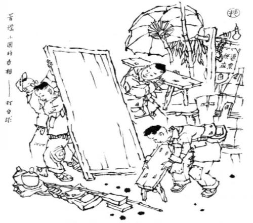 孩童正在弄堂里搭建简易乒乓台。图片来源:戴敦邦作品